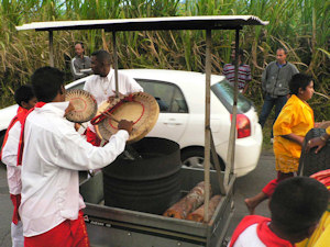 1. Hindouisme et créolisation 1.2. Hindouisme et pratiques religieuses créoles Les pratiques rituelles hindoues attirèrent rapidement des franges dominées de la population, les indiens ne pouvant que les accueillir étant donné l’ « interdiction » de refuser les volontaires à la foi hindoue (GHASARIAN 1991, 152). Ces rapprochements de la population créole vers le culte hindou furent considérablement motivés par les métissages qui, nous l’avons vu, opérèrent très rapidement malgré une volonté affichée des familles de conserver un principe d’endogamie ethnique. Selon J. BENOIST, le métissage est plus qu’un mélange biologique mais un « tissage de filiations » (J. BENOIST 1998, 265). Dans cette optique on se rend compte que les multiples ascendances permettent, si les liens ancestraux persistent un minimum, de se tourner vers de multiples pratiques religieuses (partiellement) intégrées selon les situations. La diffusion de la pratique hindoue Ces parties de la population, relativement paupérisées, semblaient rechercher au sein des cultes populaires hindous une puissance capable d’aller à l’encontre de leurs malheurs quotidiens. Mais au-delà de cela, le partage de ces cultes semblait cristalliser l’expression d’une solidarité entre groupes dominés face aux exploitants, à la volonté assimilationniste de la France en général et plus tard aux changements sociaux. Il est important de préciser que la population indienne, soucieuse de conserver son statut symbolique particulier – et dans une tentative de conservation d’un ordre hiérarchique qui, nous l’avons vu, se calque sur celui de la plantation – porte une attention particulière à la place que chacun occupe au sein du culte. C’est la raison pour laquelle elle ne confiera aux parts les « moins pures » de la population créole – c'est-à-dire les kaf (cafres) – que les étapes rituelles correspondant à ce statut inférieur (c’est pour cela qu’aujourd’hui, s’il est courant de voir les kaf ou batar-kaf battre le tambour en procession, il est en revanche moins fréquent de les voir franchir le brasier lors d’une marche sur le feu) (BENOIST 1998, 80-81). En s’appropriant des parts du rituel hindou et en utilisant la structure de cette religion (lieux, rites, etc.), la population créole donna en quelque sorte naissance à une religion populaire qui, issue de l’hindouisme, quitta « son identité exclusivement indienne pour devenir proprement réunionnaise » (J. BENOIST, 1998 : 267) et devint le lieu d’un contre-pouvoir et d’un espace de contestation fort de sa puissance symbolique.
